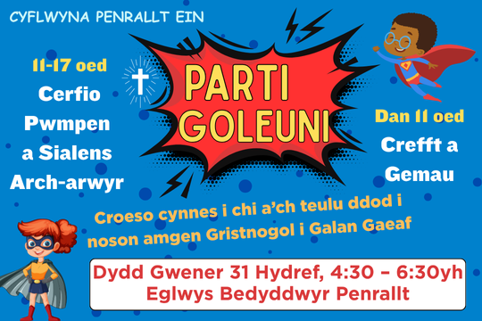 Mae ein Parti Goleuni yn rhoi ddewis amgen Cristnogol i Galan Gaeaf, efo gweithgareddau i blant o bob oedran. Cofrestrwch ymlaen llaw, os gwelwch yn dda. Bydd rhaid i bawb dan 18 oed gael eu goruchwylio gan oedolyn trwy'r amser. Rhagor o wybodaeth ar dudalen archebu.